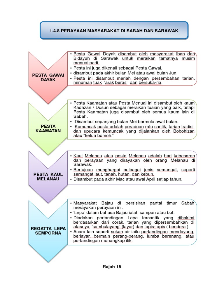 Kesultanan Melayu Pahang Perak Terengganu dan Selangor. Perayaan ini disambut oleh masyarakat Dayak di Sarawak pada 1 hb Jun setiap tahun. 101 Sarawak dan Sabah dalam Alam Melayu 102 Kemunculan Pemerintahan Tempatan 103 Kegiatan Ekonomi Masyarakat Sarawak dan Sabah 104 Keunikan Masyarakat Bumiputera Sarawak dan Sabah.